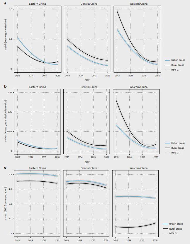 图 2. 2013–2016年中国东、中、西部城乡地区空气污染状况。a–c,我们分别展示了中国东、中、西部城乡地区的企业级废气排放(a)、企业级废气排放强度(b)以及1 km × 1 km网格级PM2.5浓度(c)。我们使用二次函数估计时间趋势,数据以估计均值(实线)±95%置信区间(灰色阴影)呈现。城乡地区分别拟合(蓝色实线代表城市地区,黑色实线代表农村地区)。所有变量均采用反双曲正弦变换(即 arsinh(x) = log[x + √x² + 1])。